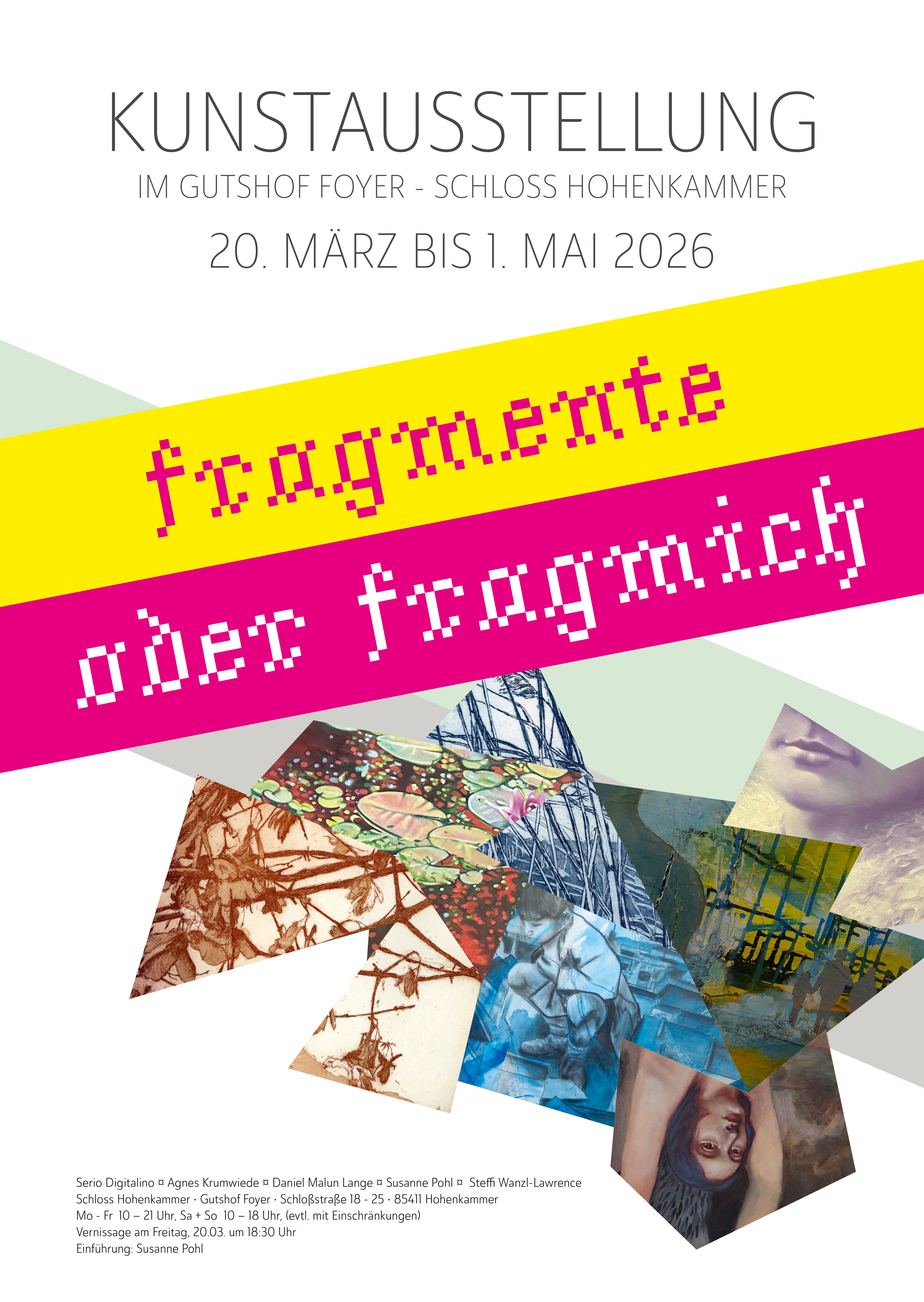„Wenn es nur eine einzige Wahrheit gäbe, könnte man nicht hundert Bilder über dasselbe Thema malen“, so sprach kein geringerer als Pablo Picasso. Fünf Künstler*innen stellen aus, fünf Arten, die Wirklichkeit zu begreifen, Fragmente, die uns ein Stück Welt erschließen können. Wir fragen Serio Digitalino, Agnes Krumwiede, Daniel Lange, Susanne Pohl und Steffi Wanzl-Lawrence nach ihrem Blickwinkel, den sie in ihren Zeichnungen, Gemälden und Grafiken im Schloss Hohenkammer präsentieren werden.